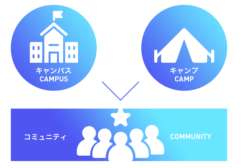 「CAMPUS」および「CAMP」の各プログラムで出会った仲間たちと継続的な情報交換や活動ができるようにSNSでのオンライングループを用意し、自由に交流できるコミュニティづくりを行います。